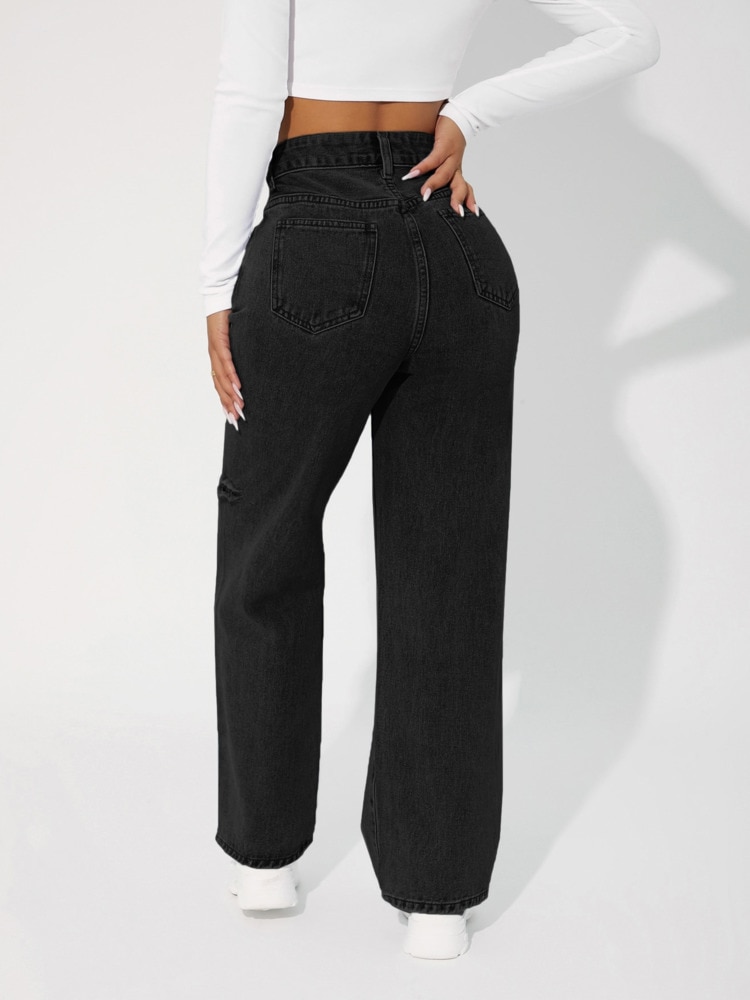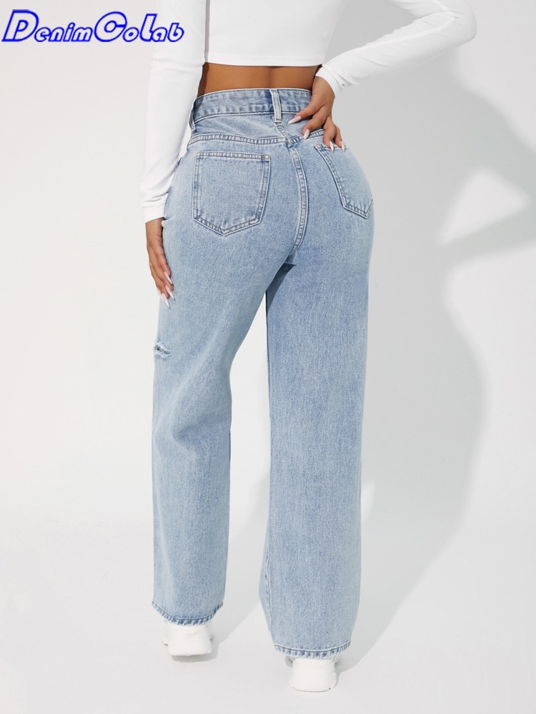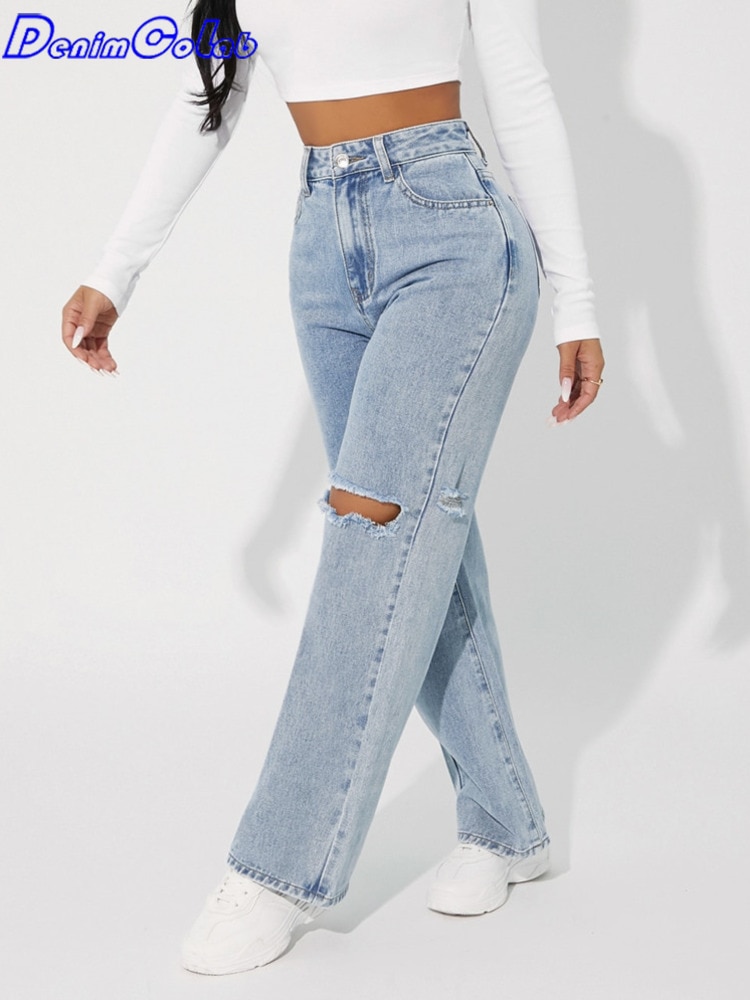 Denimcolab High Waist Straight Pant Fashion Hole In Knee Jeans Woman Loose Boyfriend Jeans Lady Streetwear Cut Out Denim Trouser