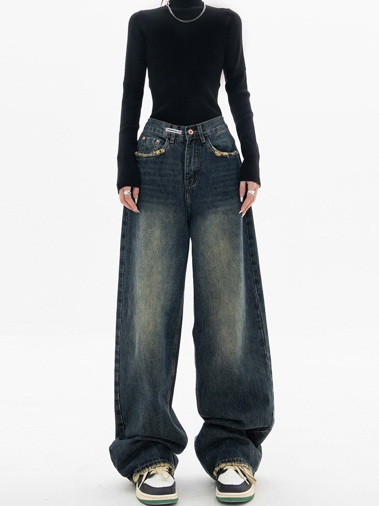 Women Vintage Streetwear Korean Baggy Cargo Jeans High Waist Straight Wide Leg Pants Denim Trousers Fairy Grunge Alt Clothes