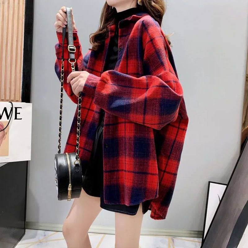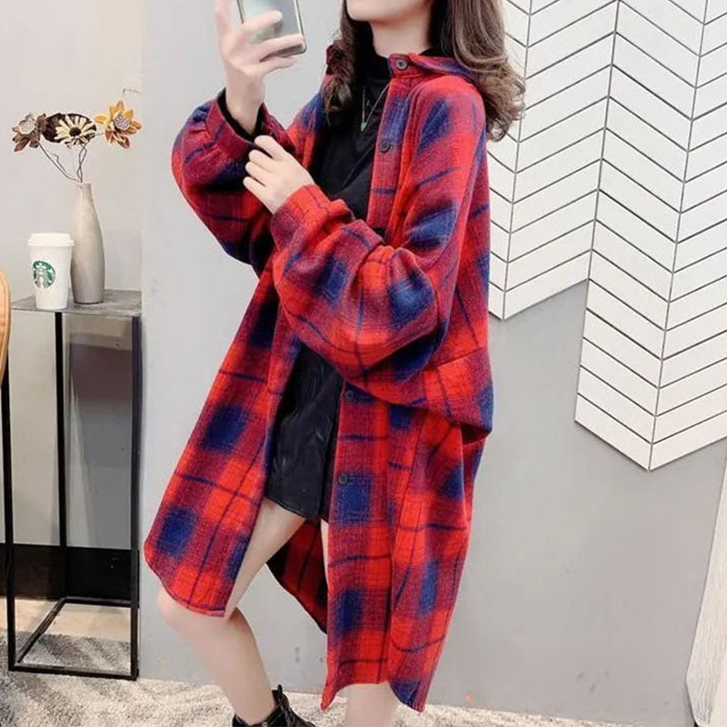 2022 spring Autumn Plaid shirt Female medium long lantern sleeve Loose wild casual coat Vintage Hong Kong flavor Long sleeve