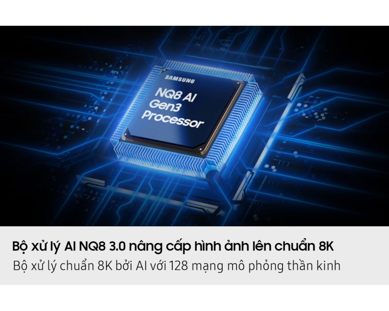 Bộ xử lý Samsung NQ8 AI Gen3. Công nghệ nâng cấp AI 8K Pro. Thiết kế Infinity Air cho Neo QLED 8K. Chế độ Glare Free hiển thị màn hình Không có chế độ Glare Free và Có chế độ Glare Free.
