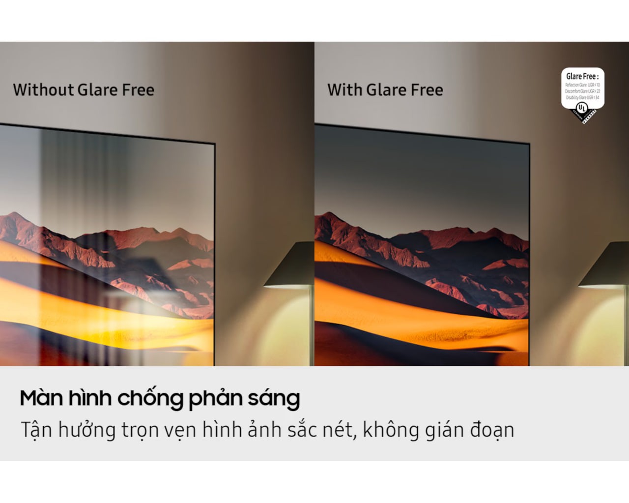 Màn hình TV không có công nghệ chống phản sáng có phản chiếu gây phân tâm. Bên cạnh đó, màn hình TV có công nghệ chống phản sáng hiển thị rõ ràng một cảnh núi non. Logo được xác nhận bởi UL. Chống phản sáng: Độ phản sáng UGR < 10, Chói gây khó chịu < UGR 22, Sáng lóa < 34. verifyUL.com®. V166045.
