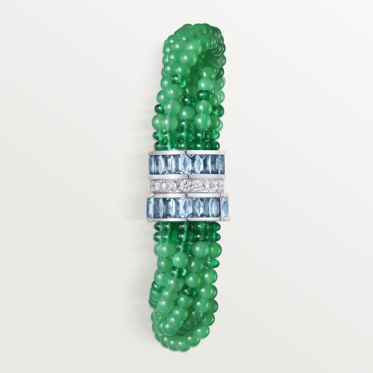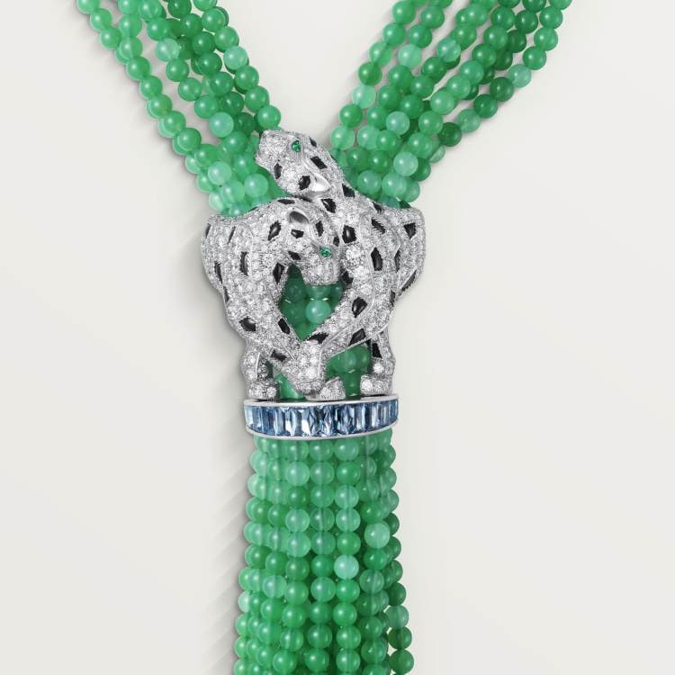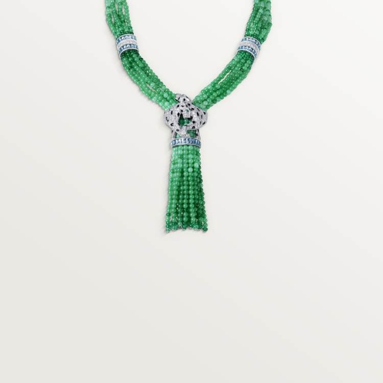 PANTHÈRE DE CARTIER necklace, 750‰ white gold, set with 175 emeralds, 42 onyx leopard spots, 2 onyx leopard noses, 83 aquamarines, 1,610 chrysoprase, 456 round brilliants totaling 8.70 carats cut diamond.