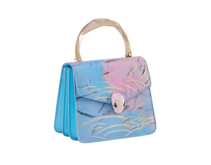 The SERPENTI FOREVER OCEAN limited edition small handbag comes from the SERPENTI IN ART capsule series jointly created by BULGARI and contemporary artist Zhou Li, showing its creative style. The body of the bag is exquisitely made of ocean blue calfskin, decorated with gold embroidery, and matched with SPLISH SPLASH light blue calfskin sides, vividly depicting a secret dream-like mood and praising mankind's unremitting pursuit of freedom and hope. At the same time, artist Zhou Li reinterprets the light gold-plated brass handle with geometric shapes that complement the golden mirror finish and pink quartz inlay. The work is paired with a snake-shaped chain and leather shoulder strap, decorated with the iconic snake head magnetic clasp. Its charming design and scales draw inspiration from the SERPENTI series of jewelry from the 1960s. It has three compartments, a mirror pocket with a customizable vanity mirror and an inner metal nameplate engraved with "ZHOU LI X BULGARI", with the BULGARI metal logo on the back. 18.5 X 15 X 10.5 cm - 7.3 X 5.9 X 4.1 inches. made in Italy.