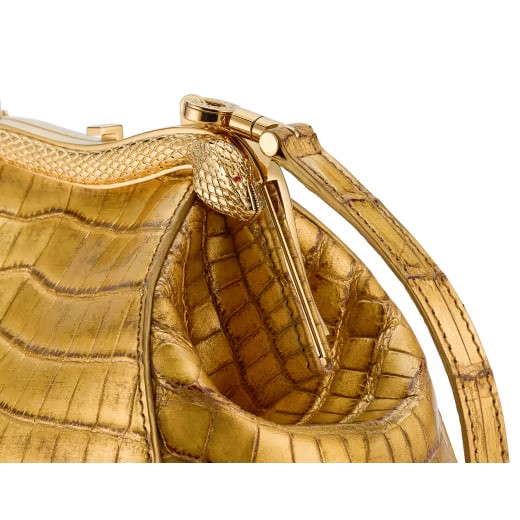 The precious Serpentine series small clutch bag is handcrafted from golden soft crocodile leather and cleverly decorated with 24K gold foil, which is in line with Bulgari’s jewelry style. The handbag combines soft and fashionable shapes with jewelry element details, which are reminiscent of the graceful and agile posture of the snake, boldly interpreting timeless and classic style. Inspired by the bold and unruly Serpenti series antique archival necklace of the 1960s, its gold-plated brass snake-shaped frame is made of 3-micron plated 24K gold, a special tribute to Bulgari's gold decoration craftsmanship. The handbag embodies a variety of styles - a curved metal top, engraved scales on the front and red enamel eyes, elegant and charming; glossy crocodile leather inserts on the back for a casual style. Featuring a single compartment with snap-button closure and leather shoulder strap, a metal plaque on the inside engraved with the Bulgari logo and the Bulgari metal logo on the back. 19.5 x 14 x 10 cm - 7.7 x 5.5 x 3.9 inches. made in Italy.